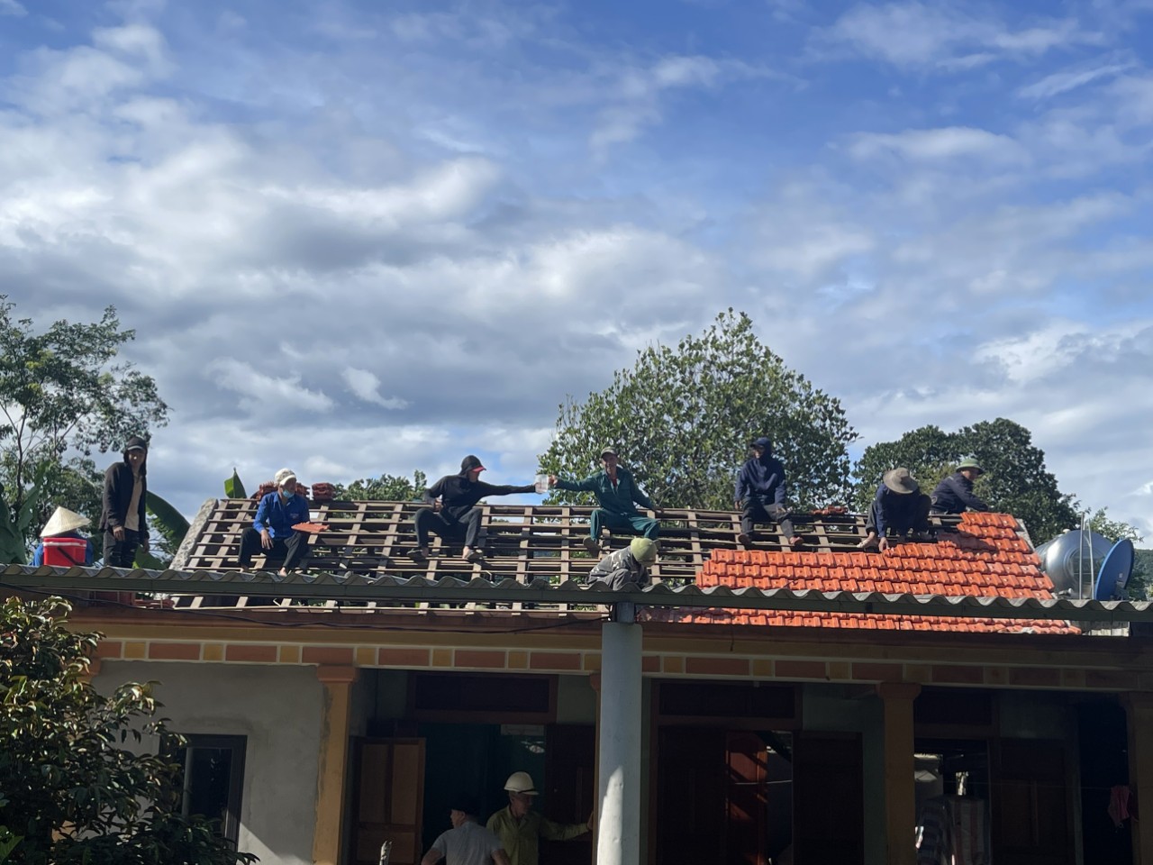 Quần quật từ sáng đến tối, hàng chục bạn trẻ cùng các cô, chú cựu chiến binh, phụ nữ đã chia nhau bốc dỡ hết lớp ngói cũ rồi lợp lên lớp ngói mới. Người cựu binh già như được tiếp thêm sức sống. Cuối ngày, tất cả cùng vây quanh trò chuyện cùng người cựu binh. Và đây chính là điều mà những bạn trẻ của xã vùng núi này mong chờ nhất.