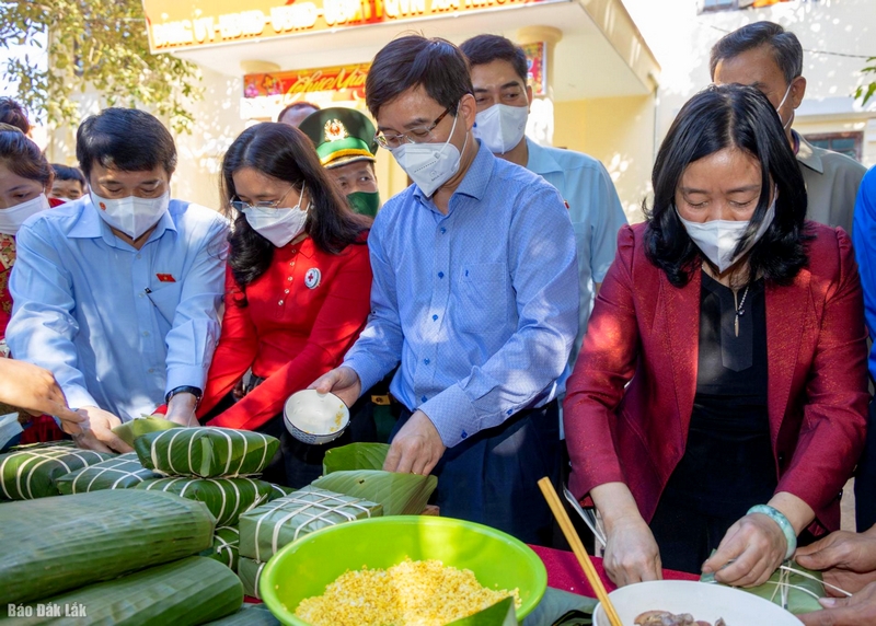 Các đồng chí lãnh đạo tham gia gói bánh chưng tại chương trình