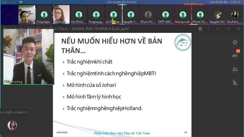 Thông qua lớp chuyên đề do thầy Hoàng Bảo Trường - Phụ trách Khoa Khoa học cơ bản, Phân hiệu Học viện Phụ nữ Việt Nam, Tổng thư ký Hội đồng giáo dục kỹ năng mềm, Viện ứng dụng Tâm lý Giáo dục đã tạo ra nhiều chương trình tương tác với các bạn học sinh, thông qua các câu đố cùng trò chơi với những tình huống để các bạn bộc lộ những khía cạnh tính cách giúp các bạn hiểu hơn về chính bản thân mình; đồng thời bổ sung cho các bạn thêm những kiến thức, kỹ năng để nhận ra các giá trị của bản thân mình, nhìn nhận một cách thực tế về khả năng, sở thích, nhu cầu xã hội để lựa chọn cho mình ngành nghề phù hợp nhất với bản thân.