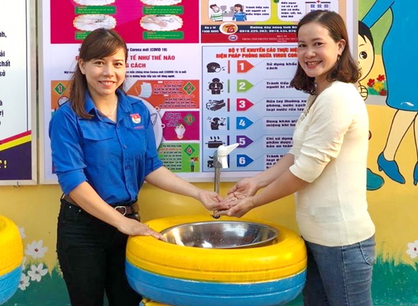 Trong 2 ngày, 15 chậu rửa tay đã được các bạn đoàn viên Chi đoàn trường mầm non Hoa Hồng và Đoàn phường Tân Bình thực hiện với tổng chi phí hơn 4 triệu đồng. Vật liệu được tận dụng từ các lốp xe ôtô đã qua sử dụng để sơn lại và đặt vừa chiếc chậu bằng inox trong lòng lốp xe cùng hệ thống ống nước, vòi rửa tay, chân đế được hàn chắc chắn, dễ di chuyển.