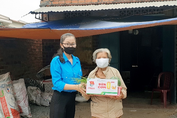 Những bữa cơm được các bạn ĐVTN trao tận tay những người già neo đơn, người bán vé số có hoàn cảnh khó khăn
