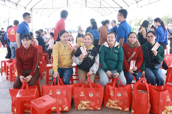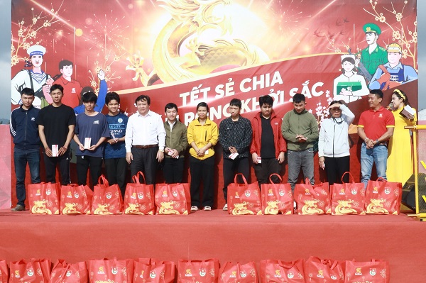 Tại sự kiện ở tỉnh Bình Định, 350 phần quà Tết trị giá 700.000 đồng/phần – bao gồm bao lì xì 300.000 tiền mặt và các nhu yếu phẩm ngày Tết – đã được trao cho các thanh niên công nhân, người lao động khó khăn trong bầu không khí nhộn nhịp đón Xuân Giáp Thìn.