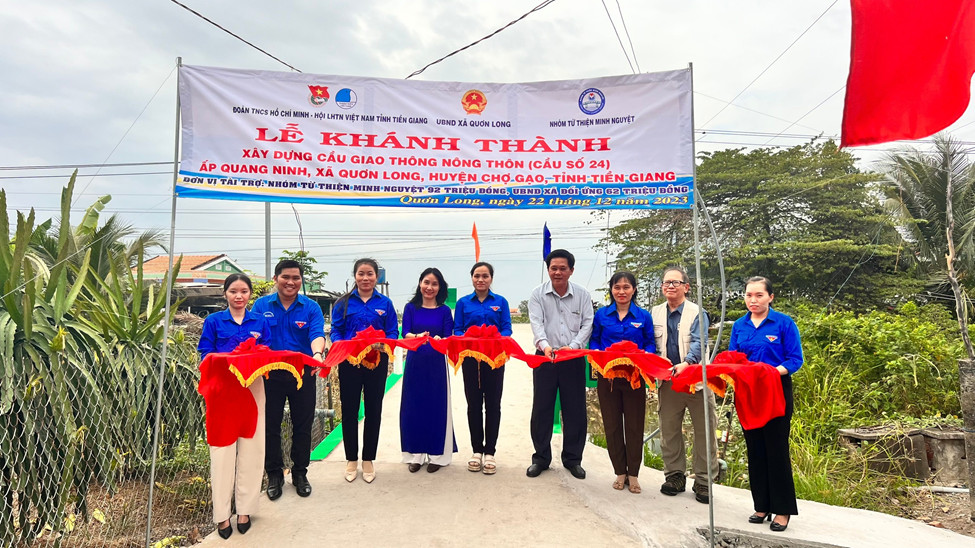 ĐTN: Chiều 22/12, Tỉnh Đoàn, Hội LHTN Việt Nam tỉnh Tiền Giang phối hợp với Ủy ban nhân xã Quơn Long và Nhóm từ thiện Minh Nguyệt đã tổ chức Lễ Khánh thành bàn giao cầu giao thông nông thôn (cầu số 24) tại ấp Quang Ninh, xã Quơn Long, huyện Chợ Gạo, tỉnh Tiền Giang.
