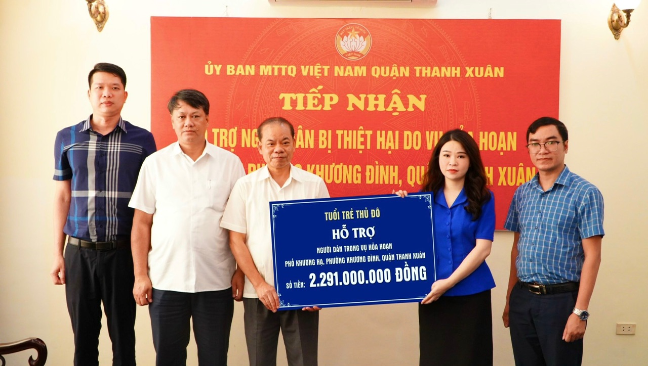 ĐTN: Chiều 21/9, tại trụ sở Quận ủy Thanh Xuân, Thành đoàn Hà Nội đã trao biển tượng trưng quyên góp ủng hộ nạn nhân trong vụ cháy chung cư mini tại phố Khương Hạ (phường Khương Đình, quận Thanh Xuân) cho Ủy ban MTTQ quận Thanh Xuân.