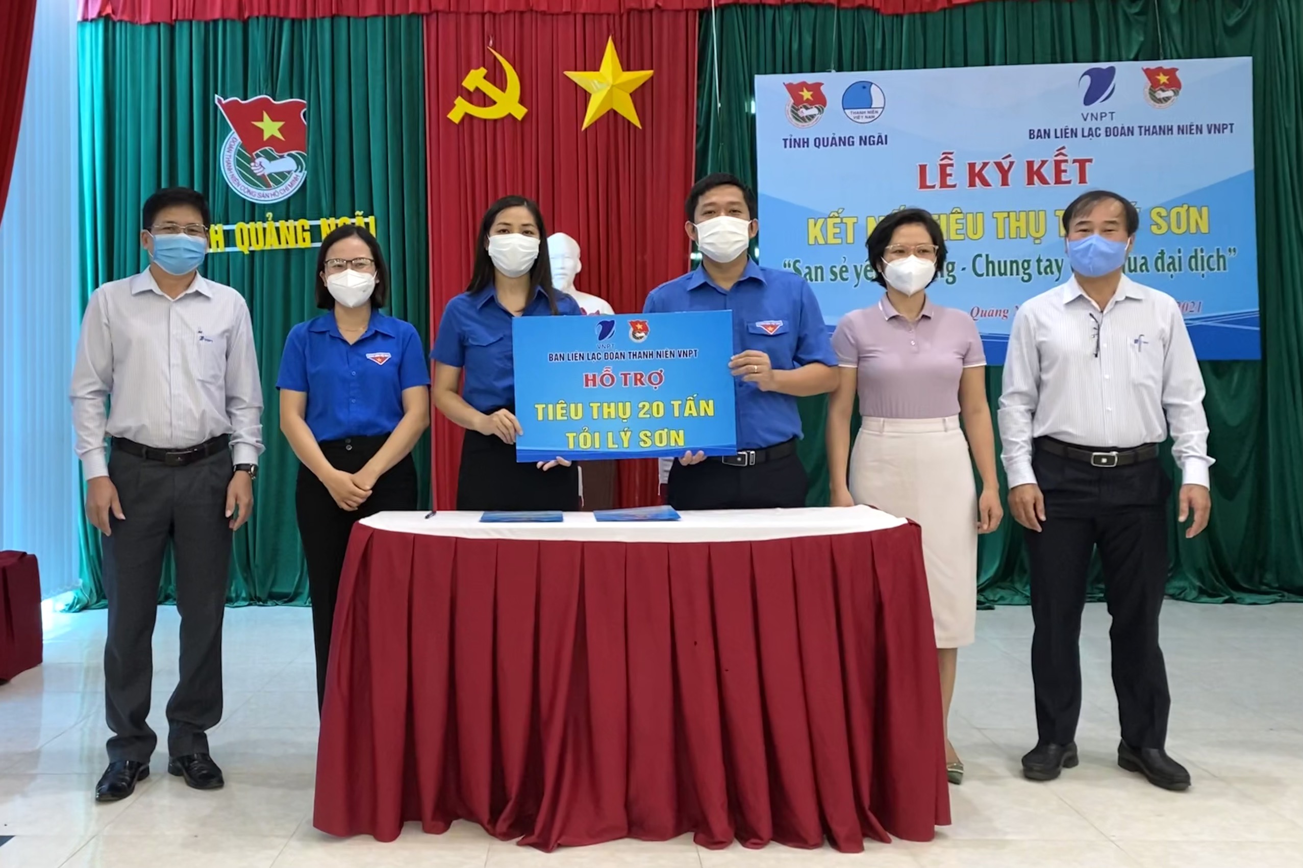 ĐTN: Thực hiện chương trình "San sẻ yêu thương - Cùng vượt qua đại dịch", sáng 20/8, đại diện Ban liên lạc Đoàn Thanh niên Tập đoàn Bưu Chính Viễn thông Việt Nam VNPT cùng Tỉnh đoàn Quảng Ngãi ký kết hỗ trợ tiêu thụ 20 tấn tỏi với giá 50.000 đồng/kg cho nông dân huyện đảo Lý Sơn.