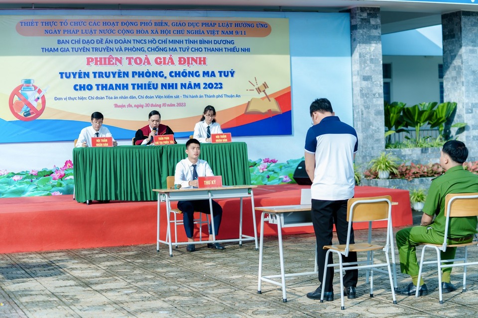 ĐTN: Thiết thực hưởng ứng Ngày pháp luật Việt Nam 09/11, sáng 30/10, tại Trường THPT Lý Thái Tổ, TP. Thuận An, Ban Chỉ đạo Đề án Đoàn TNCS Hồ Chí Minh tỉnh Bình Dương tham gia tuyên truyền và phòng, chống ma túy tổ chức phiên toà giả định tuyên truyền phòng, chống ma tuý cho hơn 1.800 đoàn viên, học sinh trên địa bàn.