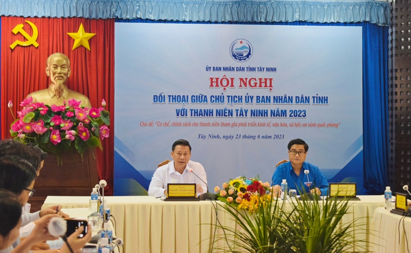 ĐTN: Sáng 23.6, UBND tỉnh Tây Ninh tổ chức Hội nghị đối thoại giữa Chủ tịch UBND tỉnh với thanh niên năm 2023 với chủ đề “Cơ chế, chính sách cho thanh niên tham gia phát triển kinh tế, văn hoá, xã hội; an ninh quốc phòng”. Đồng chí Nguyễn Thanh Ngọc - Chủ tịch UBND tỉnh và đồng chí Nguyễn Thanh Tùng - Bí thư Tỉnh đoàn chủ trì Hội nghị.