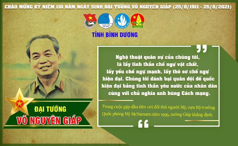 ĐTN: Kỷ niệm 110 năm ngày sinh Đại tướng Võ Nguyên Giáp (25/8/1911-25/8/2021), Tỉnh Đoàn Bình Dương trân trọng ra mắt Bộ ấn phẩm Infographic tuyên truyền cuộc đời và sự nghiệp hoạt động cách mạng cùng những câu nói bất hủ của Đại tướng Võ Nguyên Giáp - người anh cả của Quân đội nhân dân Việt Nam.