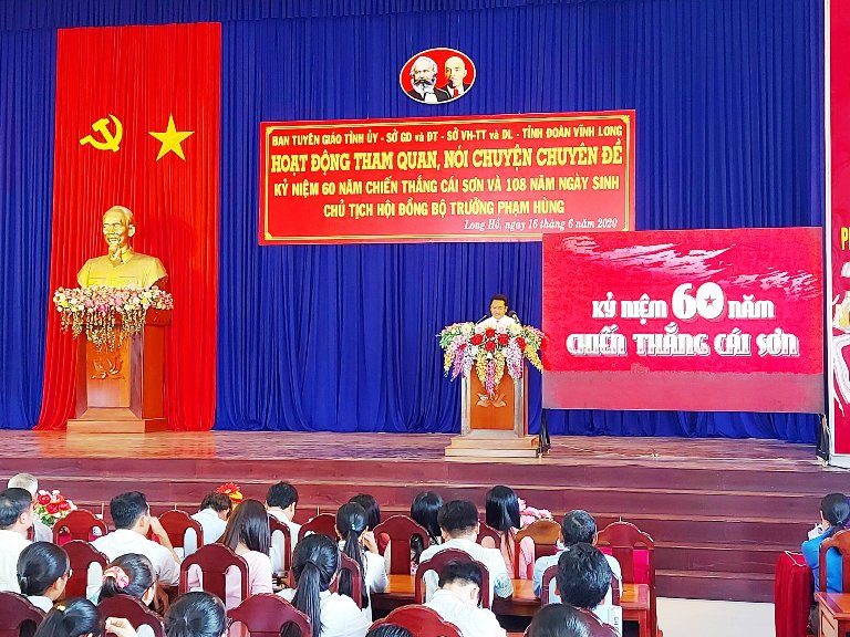 Web.ĐTN: Sáng 16/6, Ban Tuyên giáo Tỉnh uỷ phối hợp với Sở Giáo Dục và Đào tạo, Sở Văn hoá - Thể thao và Du lịch, Tỉnh đoàn Vĩnh Long tổ chức thăm quan và nghe nói chuyện chuyên đề nhân kỷ niệm 60 năm Chiến thắng Cái Sơn và 108 năm ngày sinh Chủ tịch Hội đồng Bộ trưởng Phạm Hùng.