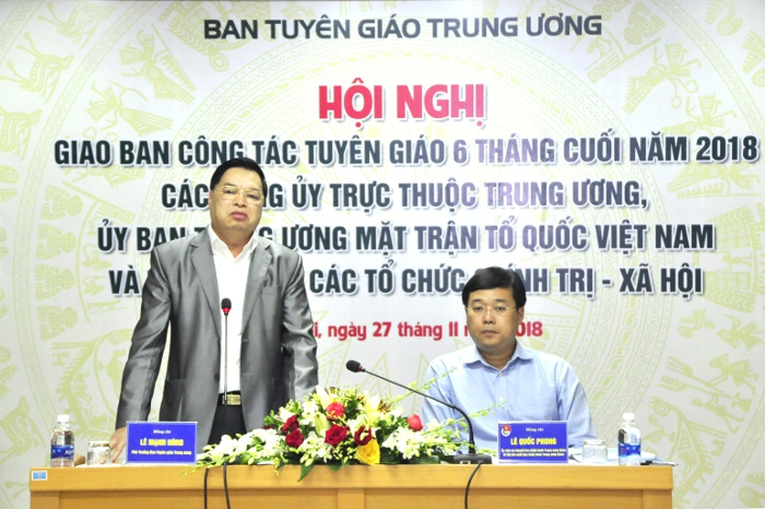 Web.ĐTN: Hội nghị giao ban công tác tuyên giáo 6 tháng cuối năm 2018 các Đảng ủy trực thuộc Trung ương, Ủy ban Trung ương Mặt trận Tổ quốc Việt Nam và Trung ương các tổ chức chính trị - xã hội (gọi tắt là Cụm số 1) đã diễn ra chiều ngày 27/11, tại trụ sở Trung ương Đoàn TNCS Hồ Chí Minh (Hà Nội).