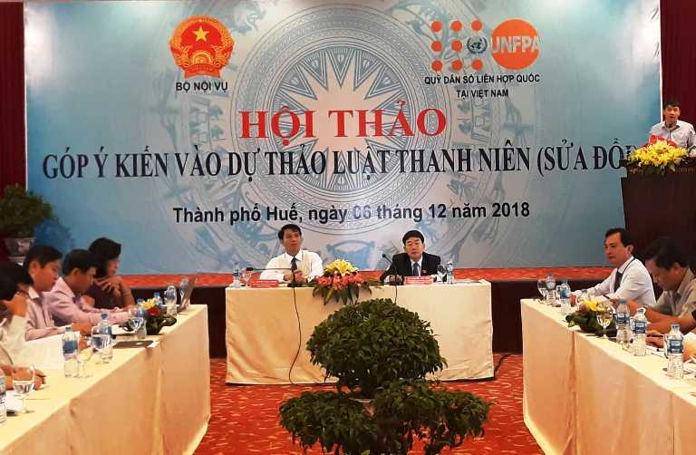 Web.ĐTN: Sáng ngày 06/12, tại TP. Huế; Bộ Nội vụ, Trung ương Đoàn, Uỷ ban Văn hoá, Giáo dục, Thanh niên, Thiếu niên và Nhi đồng của Quốc Hội và Quỹ Dân số Liên Hợp Quốc tại Việt Nam phối hợp tổ chức Hội thảo Góp ý kiến vào dự thảo Luật Thanh niên (Sửa đổi).