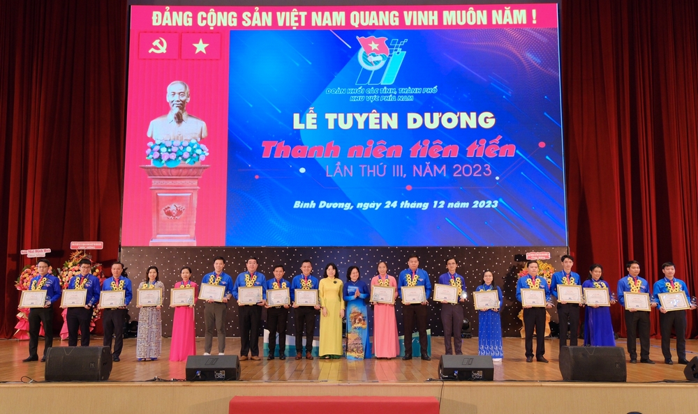 ĐTN: Sáng 24/12, Lễ tuyên dương Thanh niên tiên tiến Đoàn Khối các tỉnh, thành phố khu vực phía Nam lần thứ III, năm 2023 đã diễn ra tại Bình Dương. Liên hoan năm nay tuyên dương 57 đại biểu thanh niên tiên tiến đến từ 18 Đoàn khối các tỉnh, thành phố trong khu vực, là những điển hình tiêu biểu, gương điển hình của tuổi trẻ khu vực phía Nam trong việc học tập và làm theo lời Bác.