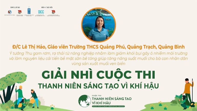 ĐTN: Cô giáo trẻ Lê Thị Hảo - trường THCS Quảng Phú, huyện Quảng Trạch xuất sắc giành giải nhì Cuộc thi “Thanh niên sáng tạo vì khí hậu – Youth for Climate Innovation Contest” với ý tưởng “Thu gom rơm, rạ thải từ nông nghiệp nhằm làm giảm khói bụi gây ô nhiễm môi trường và làm nguyên liệu cải tiến bề mặt sân bê tông giúp tăng năng suất muối cho bà con nhân dân vùng sản xuất muối ven biển”.