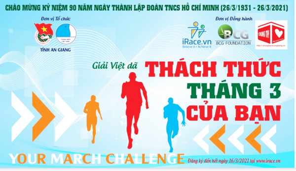 ĐTN: Ngày 15/3, Ban Thường vụ Tỉnh Đoàn An Giang phát động Giải việt dã “Thách thức tháng 3 của bạn - Your march challenge” nhằm chào mừng kỷ niệm 90 năm Ngày thành lập Đoàn TNCS Hồ Chí Minh (26/3/1931 - 26/3/2021), 75 năm Ngày Thể thao Việt Nam (27/3/1946 - 27/3/2021), hưởng ứng Tháng Thanh niên năm 2021.
