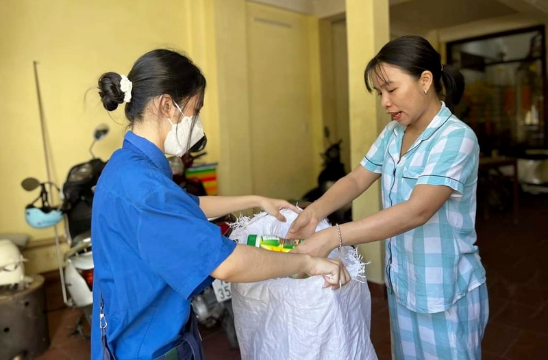Thanh niên đến từng hộ gia đình để tuyên truyền về phân loại rác tại nguồn