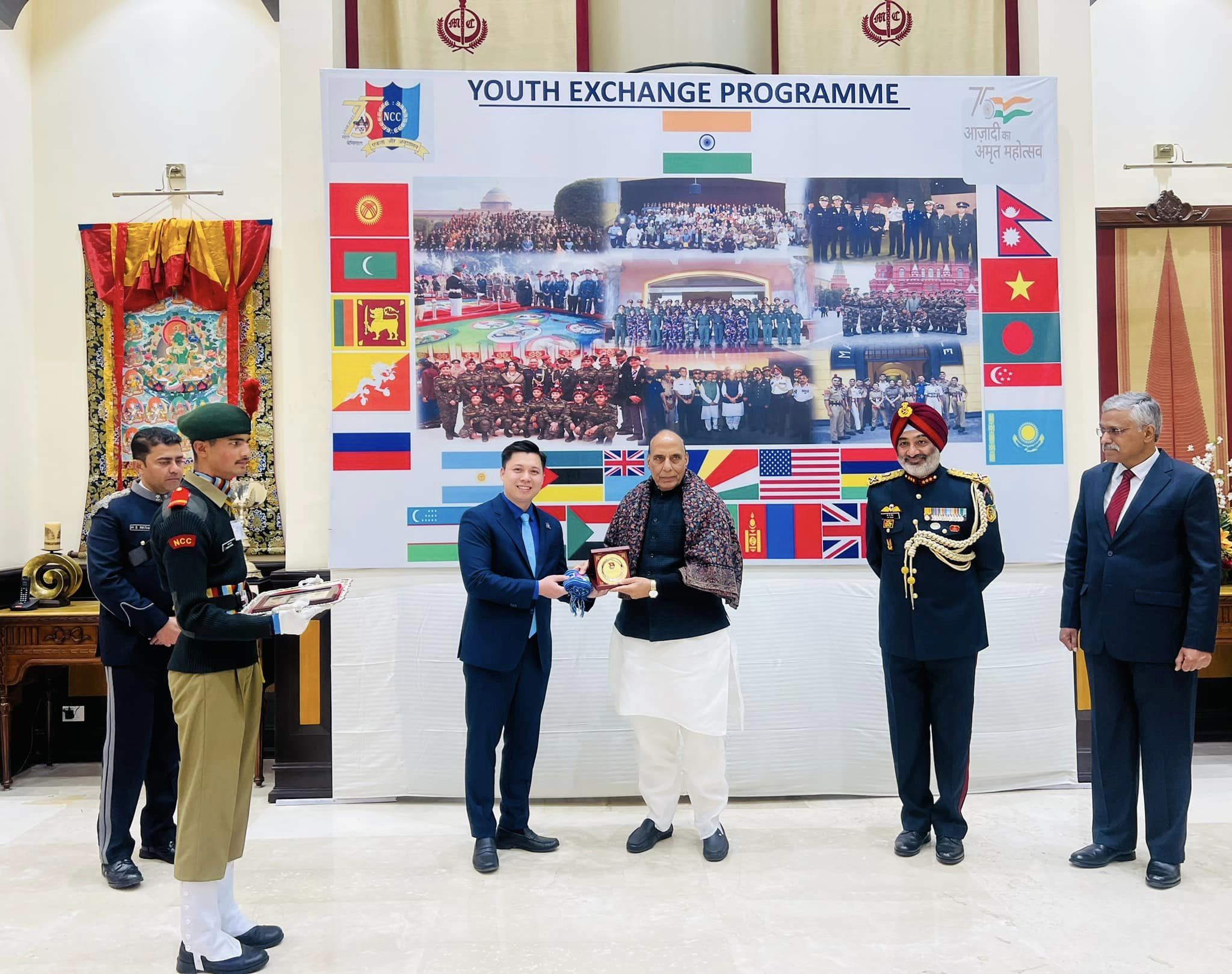 ĐTN: Trong khuôn khổ Chương trình Ngày Cộng hoà năm 2023 và giao lưu với Tổng đội Thiếu sinh quân Ấn Độ từ ngày 15 - 30/01/2023 tại Ấn Độ, Đoàn đại biểu thanh niên Việt Nam do đồng chí Vũ Gia Dân, Ủy viên Ban Chấp hành Trung ương Đoàn, Phó Trưởng Ban Công tác thiếu nhi Trung ương Đoàn làm Trưởng đoàn đã đến tiếp kiến Bộ trưởng Bộ Quốc phòng Ấn Độ - Ngài Shri Rajnath Singh.