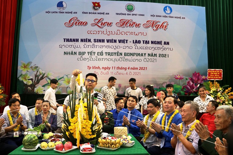 ĐTN: Không thể về quê đón tết Bunpimay (tết cổ truyền của nước CHND Lào), nhưng hàng trăm sinh viên Lào vẫn đón một cái tết đầm ấm ở Nghệ An. Những người bạn đất nước Triệu voi đón tết xa quê, nhưng vẫn được tham gia trọn vẹn các nghi lễ truyền thống như: Lễ cầu may, té nước, buộc chỉ cổ tay, múa lăm - vông.