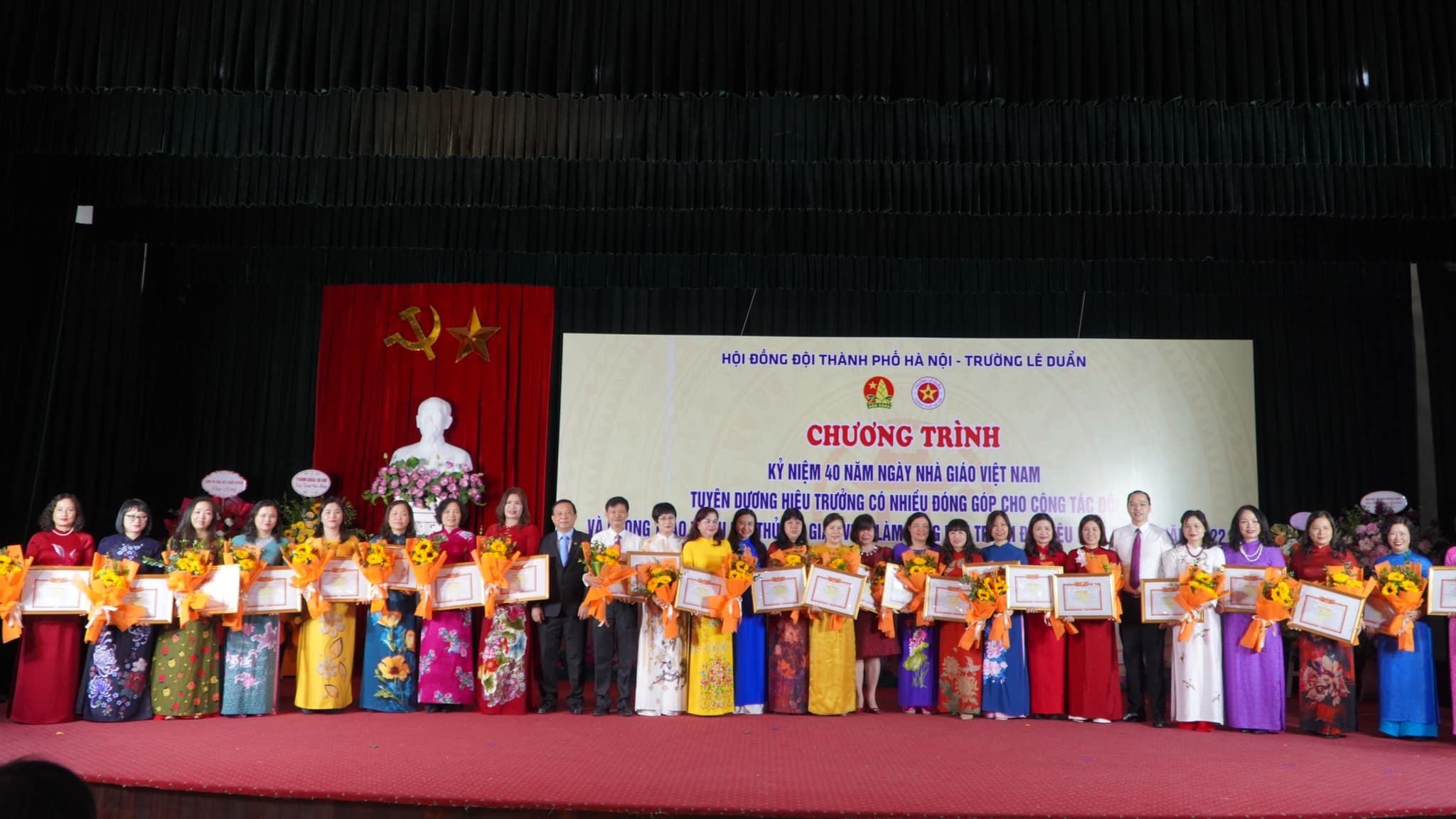 ĐTN: Ngày 19/11, Thành đoàn - Hội đồng Đội thành phố Hà Nội, trường Lê Duẩn tổ chức chương trình kỷ niệm 40 năm Ngày nhà giáo Việt Nam (20/11/1982 - 20/11/2022); tuyên dương các thầy cô Hiệu trưởng khối tiểu học và trung học cơ sở có nhiều đóng góp cho công tác Đội và phong trào thiếu nhi Thủ đô, giáo viên làm Tổng Phụ trách Đội tiêu biểu của Thủ đô năm 2022.