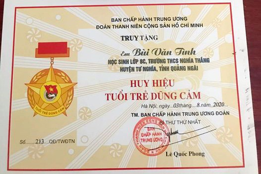 Web.ĐTN: Sáng 16/9, thừa ủy quyền của Trung ương Đoàn, anh Cao Lê Tùng Nghĩa, Phó Bí thư Tỉnh đoàn, Chủ tịch Hội đồng Đội tỉnh Quảng Ngãi đã đến thắp hương, truy tặng huy hiệu Tuổi trẻ dũng cảm của Trung ương Đoàn cho em Bùi Văn Tình tại xã Nghĩa Thắng, huyện Tư Nghĩa, Quảng Ngãi.