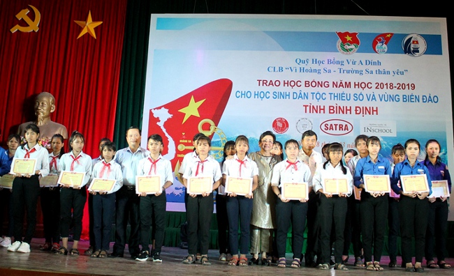 Web.ĐTN: Chiều ngày 28/03, tại Trung tâm hoạt động thanh thiếu nhi tỉnh Bình Định, Tỉnh đoàn, Sở Giáo dục và Đào tạo tỉnh phối hợp với Văn phòng đại diện phía Nam Quỹ học bổng Vừ A Dính, CLB “Vì Hoàng Sa - Trường Sa thân yêu” tổ chức Lễ trao học bổng cho học sinh dân tộc thiểu số và vùng biển đảo tỉnh Bình Định năm học 2018 - 2019.