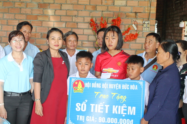 Web.ĐTN: Sáng ngày 14/12, Hội đồng Đội tỉnh Long An, Hội đồng Đội huyện Đức Hòa đã đến thăm và trao sổ tiết kiệm cho 3 em học sinh có cha mẹ bị điện giật chết tại xã Đức Lập Hạ, huyện Đức Hòa vừa qua.