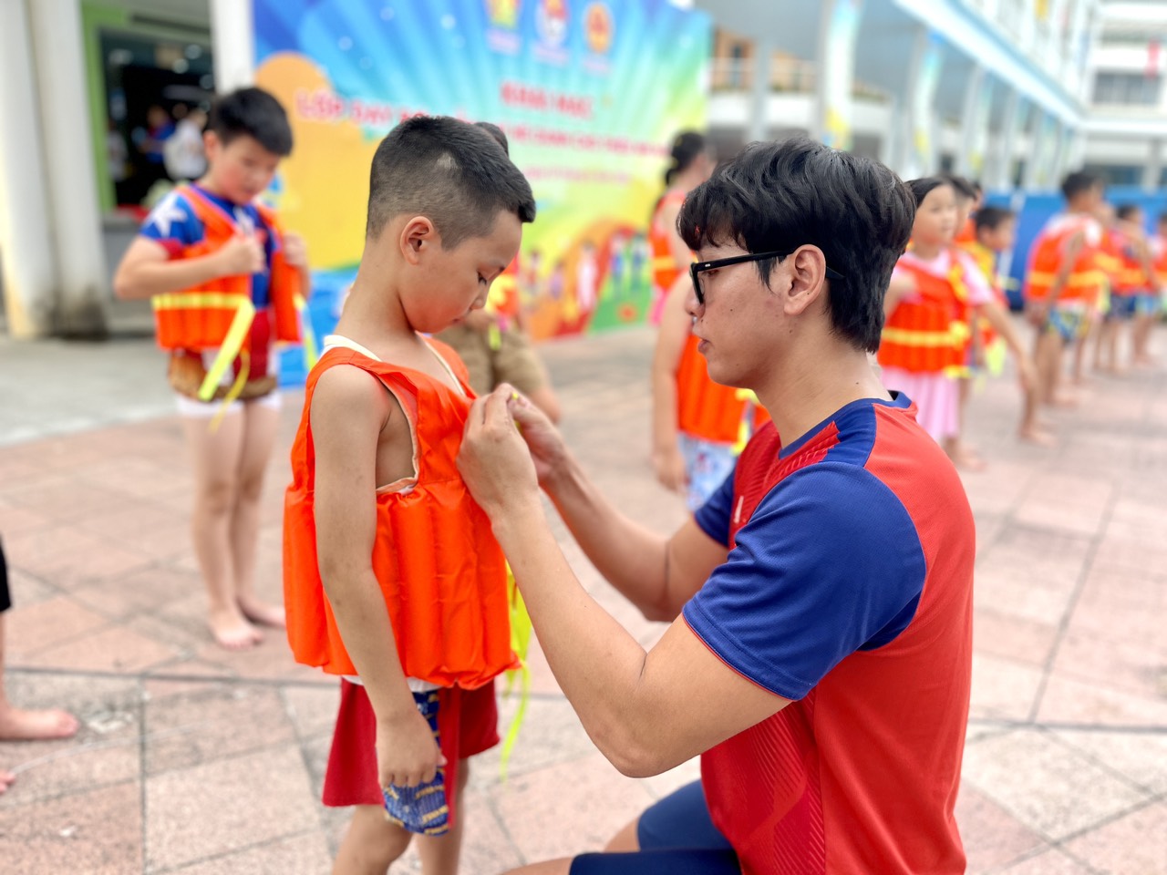 ĐTN: Lớp dạy bơi miễn phí cho thiếu nhi hè năm 2024 được tổ chức tại Cung Văn hoá Thanh thiếu nhi Quảng Ninh. Trong ngày khai mạc, vận động viên Hoàng Quý Phước tham gia hướng dẫn các em nhỏ kỹ thuật bơi lội.