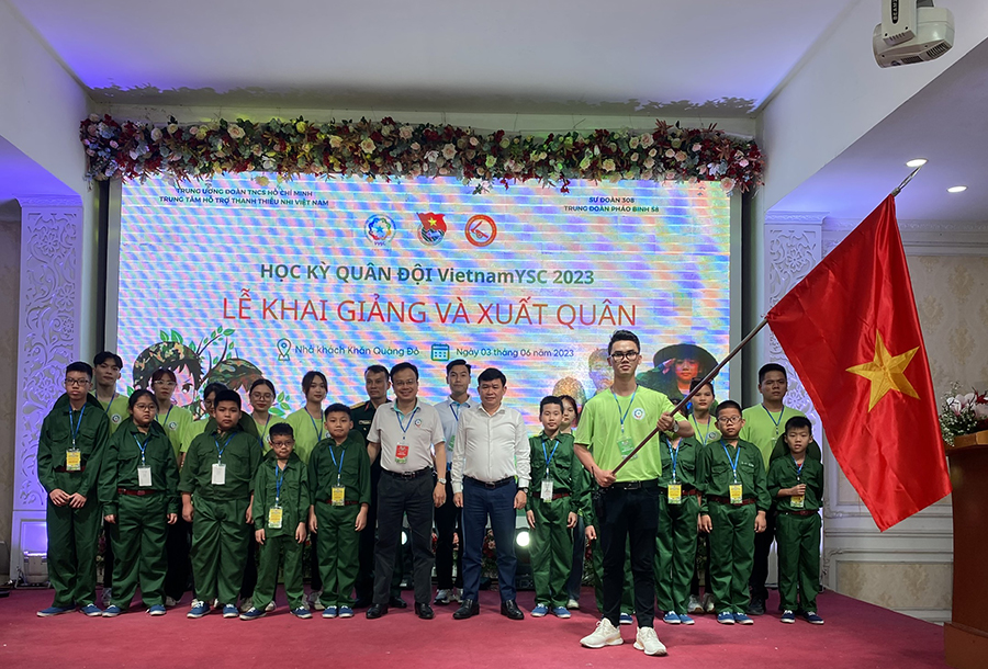ĐTN: Ngày 3/6, tại Hội trường Thanh Niên - Nhà khách Khăn Quàng Đỏ (Hà Nội), Trung tâm Hỗ trợ Thanh thiếu nhi Việt Nam đã tổ chức Lễ Khai giảng và xuất quân Học kỳ Quân đội 2023 cho hơn 150 em nhỏ với chủ đề "Chiến sĩ Học kỳ Quân đội” - Những bước chân Phù Đổng 2023