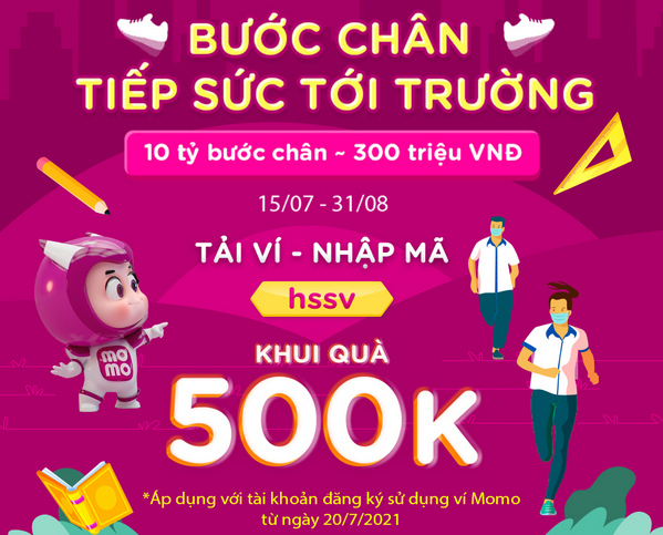 ĐTN: “Bước chân tiếp sức tới trường” - Chương trình đi bộ gây quỹ thực hiện các hoạt động hỗ trợ và phát triển sinh viên do Trung ương Hội Sinh viên Việt Nam phối hợp với Công ty Cổ phần Di động trực tuyến (Ví điện tử Momo) thực hiện từ ngày 15/7 đến 31/8. Đến nay, chương trình đã đạt 8,1 tỷ bước chân.
