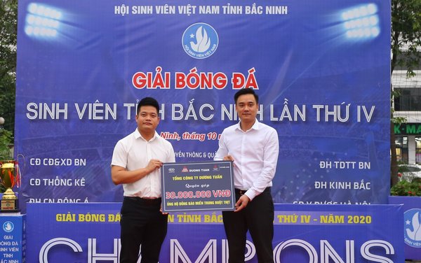 Web.ĐTN: Chiều 28/10, tại lễ bế mạc giải bóng đá Sinh viên tỉnh Bắc Ninh lần thứ IV năm 2020, đồng chí Trần Văn Đăng - Phó Bí thư Tỉnh Đoàn, Chủ tịch Hội Sinh viên tỉnh Bắc Ninh đã tiếp nhận các nguồn lực ủng hộ từ Đoàn TN, Hội Sinh viên các trường Đại học, Cao đẳng, các doanh nghiệp, tổ chức, cá nhân trong tỉnh ủng hộ đồng bào miền Trung.
