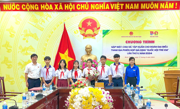 ĐTN: Sáng ngày 17/9/2024, tại Hội trường Văn phòng Đoàn Đại biểu Quốc hội và Hội đồng nhân dân tỉnh Bình Thuận, Ban Thường vụ Tỉnh đoàn, Hội đồng Đội tỉnh phối hợp cùng Đoàn Đại biểu Quốc hội tỉnh Bình Thuận tổ chức buổi gặp mặt, chia sẻ và tập huấn cho đại biểu thiếu nhi trước thềm phiên họp giả định “Quốc hội trẻ em” lần thứ II, năm 2024.