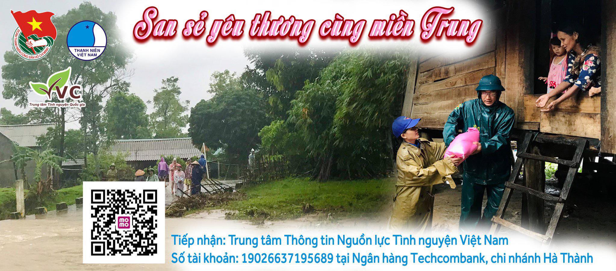 Web.ĐTN: Trung ương Đoàn TNCS Hồ Chí Minh, Trung ương Hội LHTN Việt Nam kêu gọi đoàn viên thanh niên, cán bộ, công chức, viên chức, người lao động, lực lượng vũ trang, các tầng lớp nhân dân, các cơ quan, đơn vị, tổ chức, doanh nghiệp, các nhà hảo tâm trong cả nước cùng chung tay chia sẻ, ủng hộ nhân dân vùng bị thiệt hại do bão lũ gây ra tại miền Trung.