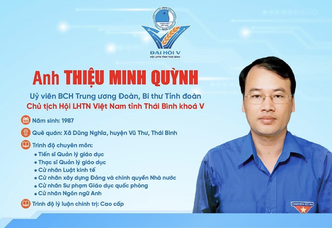 Anh Thiệu Minh Quỳnh - Bí thư Tỉnh Đoàn, Chủ tịch Hội LHTN Việt Nam tỉnh Thái Bình khóa IV, nhiệm kỳ 2019-2024 tái đắc cử Chủ tịch Hội LHTN Việt Nam tỉnh Thái Bình khóa V, nhiệm kỳ 2024-2029.