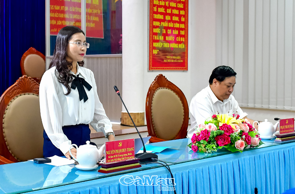 ĐTN: Làm việc về thực hiện Nghị quyết số 25-NQ/TW tại Cà Mau, đồng chí Nguyễn Phạm Duy Trang, Bí thư T.Ư Đoàn, Chủ tịch Hội đồng đội T.Ư đề nghị, tỉnh cần tăng cường kiểm tra, giám sát việc thực hiện Nghị quyết tại cơ sở; quan tâm, tạo điều kiện cho thanh niên tham gia các chương trình phát triển kinh tế - xã hội, dành nguồn lực cho thanh niên khởi nghiệp…