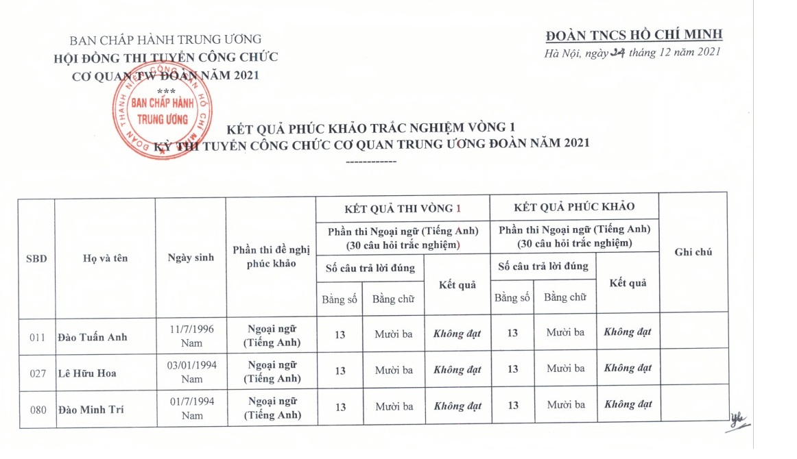 ĐTN: Sau khi thông báo kết quả thi trắc nghiệm vòng 1 kỳ thi tuyển công chức cơ quan TƯ Đoàn (tại thông báo số 579-TB/TWĐTN-BTC), đến hết ngày 21/12/2021, Hội đồng thi tuyển công chức cơ quan TƯ Đoàn nhận được 03 đơn phúc khải kết quả thi vòng 1.