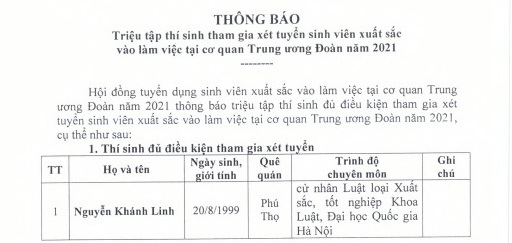 Thông báo triệu tập thí sinh tham gia xét tuyển sinh viên xuất sắc vào làm việc tại cơ quan TƯ Đoàn năm 2021