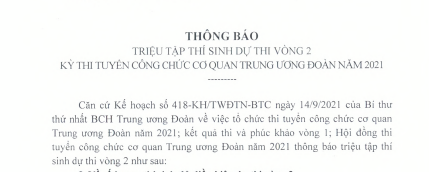 Thông báo triệu tập thí sinh dự thi vòng 2 kỳ thi tuyển công chức cơ quan TƯ Đoàn năm 2021