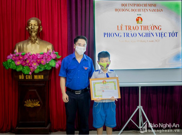 ĐTN: Nhằm tuyên dương hành động đẹp của em Lương Xuân Mạnh Tân (10 tuổi) trú ở khối Ba Hà, thị trấn Nam Đàn, sáng ngày 9/6, Hội đồng Đội huyện Nam Đàn đã tổ chức Lễ trao thưởng "Phong trào nghìn việc tốt", trao tặng cho em Giấy khen của Hội đồng Đội tỉnh Nghệ An.