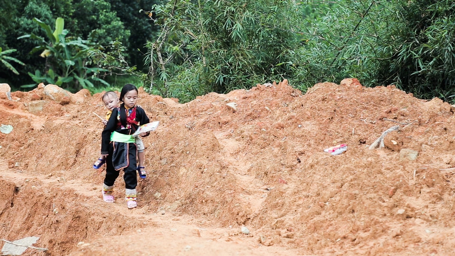 Cô bé cõng em băng suối đến trường