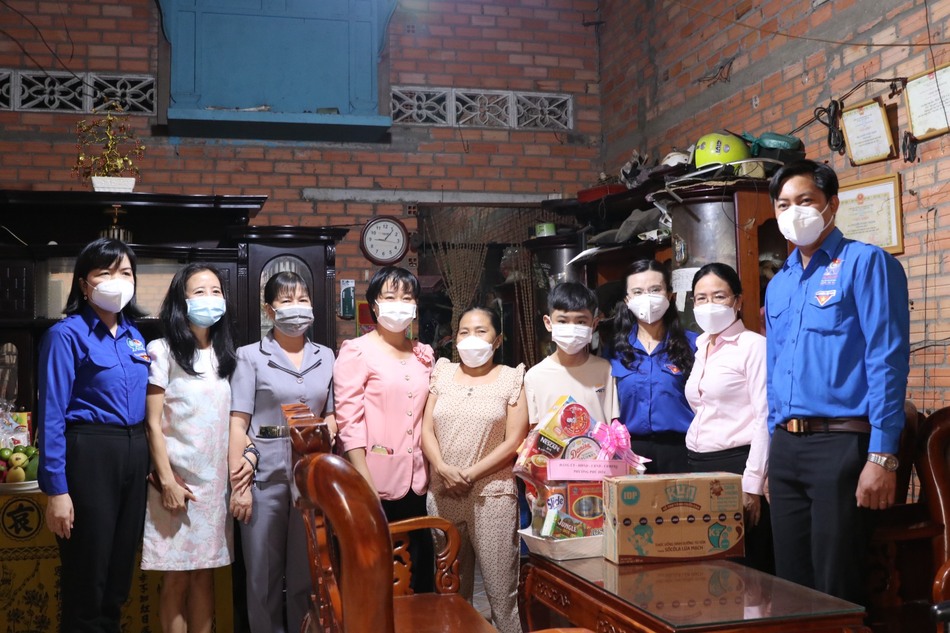 Trong khuôn khổ Chương trình, Đoàn công tác đã đến thăm, động viên và trao tặng các phần quà cho gia đình 02 em học sinh mồ côi do dịch Covid-19 là em Nguyễn Tiến Đạt và em Nguyễn Trọng Bình. Được biết em Nguyễn Tiến Đạt là học sinh lớp 4, trường tiểu học Phú Hòa 3, hiện em đang sống tại nhà trọ số 364, đường Nguyễn Thị Minh Khai, phường Phú Hòa, TP.TDM, ba mất do chích vắc- xin ngừa Covid-19, em ở trọ cùng mẹ, mẹ không có việc làm ổn định, gia đình thuộc diện khó khăn; Em Nguyễn Trọng Bình là học sinh lớp 3, Trường TH Phú Lợi, thành phố Thủ Dầu Một, hiện em đang sống tại số nhà 657/14, tổ 85, khu 9, phường Phú Lợi, TP.TDM, gia đình thuộc hộ nghèo, mẹ mới mất vì Covid-19, cha bị tai nạn nên giảm sức lao động, thu nhập không ổn định.