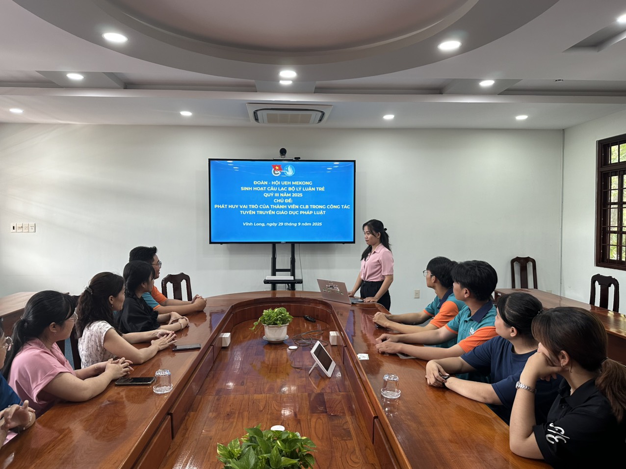Công tác tuyên truyền, giáo dục Chiều ngày 29/9/2025, Ban Chủ nhiệm Câu lạc bộ Lý luận trẻ Trường Đại học Kinh tế TP.HCM – Phân hiệu tại Vĩnh Long tổ chức sinh hoạt định kỳ quý III, năm 2025 với chủ đề “Phát huy vai trò của thành viên Câu lạc bộ trong công tác tuyên truyền, giáo dục pháp luật”.