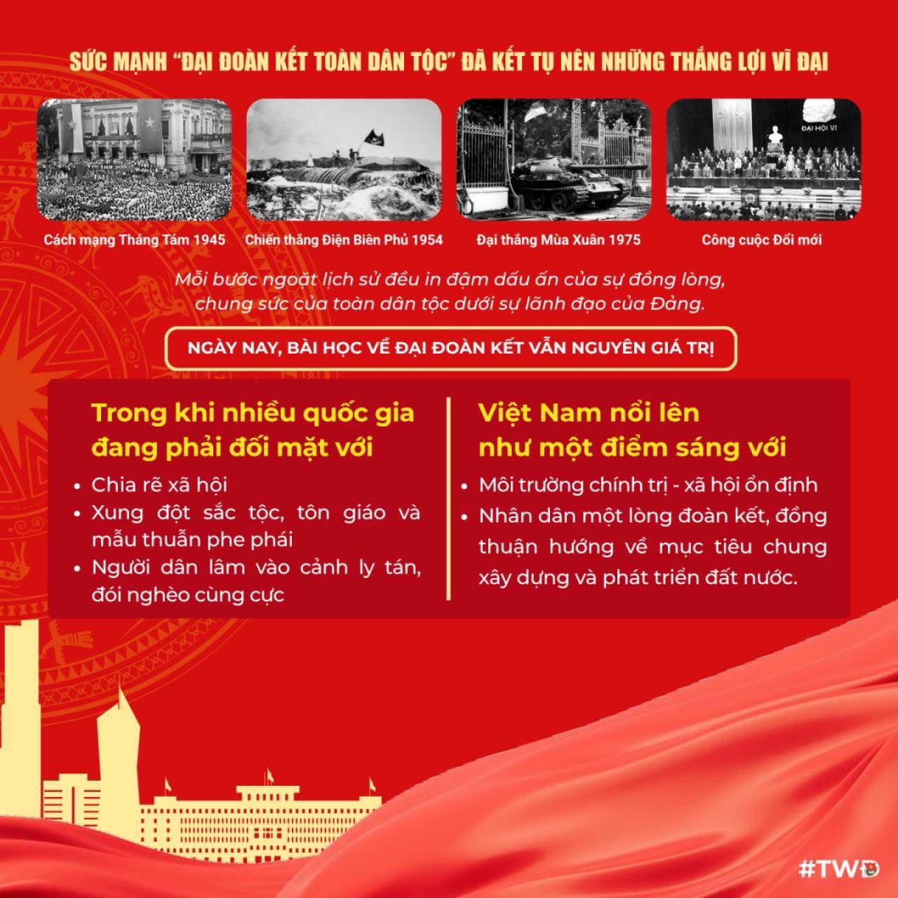 Trung ương Đoàn TNCS Hồ Chí Minh trân trọng giới thiệu bộ infographics được xây dựng từ bài viết của Tổng Bí thư Tô Lâm: “Phát huy sức mạnh đại đoàn kết toàn dân tộc để phát triển đất nước”. Bài viết khẳng định giá trị trường tồn của tinh thần đại đoàn kết và nhấn mạnh tư tưởng xuyên suốt: “đoàn kết vì tương lai phồn vinh của đất nước”.