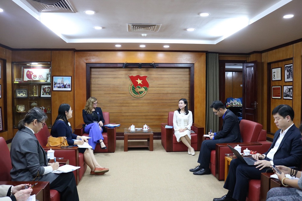 Đồng chí Nguyễn Phạm Duy Trang và Trưởng Đại diện Quỹ Nhi đồng Liên hợp quốc tại Việt Nam trao đổi tại buổi tiếp