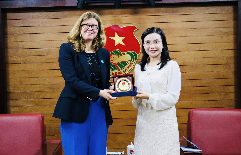 Đồng chí Nguyễn Phạm Duy Trang trao tặng biểu trưng Đoàn TNCS Hồ Chí Minh cho bà Silvia Danailov- Trưởng Đại diện Quỹ Nhi đồng Liên hợp quốc tại Việt Nam