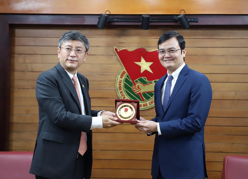 Đồng chí Bùi Quang Huy- Bí thư thứ nhất Trung ương Đoàn trao tặng biểu trưng Đoàn TNCS Hồ Chí Minh cho Đại sứ nước Cộng hòa Ấn Độ tại Việt Nam Tshering W.Sherpa