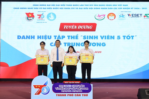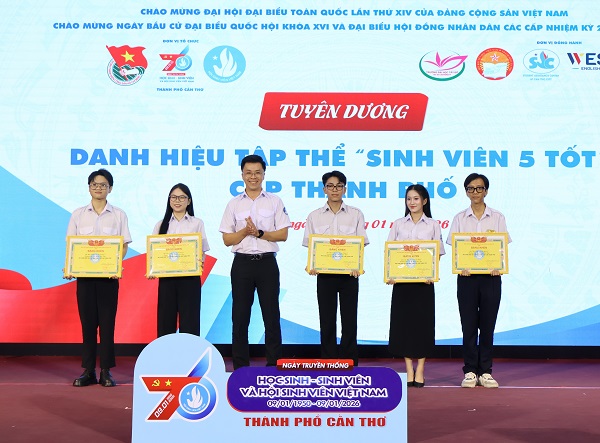 Đồng chí Đào Chí Nghĩa, Thành ủy viên, Phó Trưởng đoàn Đại biểu Quốc hội thành phố Cần Thơ và đồng chí Trần Việt Tuấn, Phó Bí thư Thành đoàn, Chủ tịch Hội Sinh viên Việt Nam thành phố Cần Thơ trao bằng khen cho các bạn đạt danh hiệu “Sinh viên 5 tốt” cấp Trung ương.
