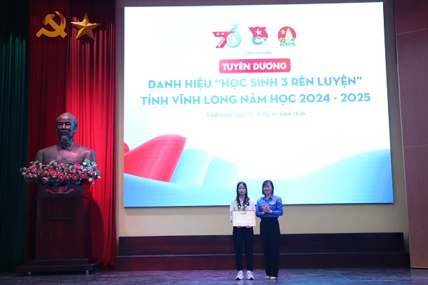 Đồng chí Nguyễn Thị Hồng Nhung - Ủy viên Ban Thường vụ Tỉnh ủy, Phó Chủ tịch Thường trực Ủy ban Mặt trận Tổ quốc Việt Nam tỉnh Vĩnh Long và đồng chí Trần Trí Cường – Ủy viên BCH Trung ương Đoàn, Bí thư Tỉnh đoàn trao thưởng cho các bạn học sinh đạt danh hiệu học sinh 3 tốt cấp tỉnh