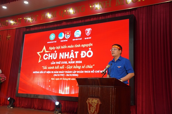 Mỗi ngày 1 tin tốt - Mỗi tuần 1 câu chuyện đẹp ĐTN: Sáng 01/02/2026, Ban Thường vụ Thành Đoàn, Ban Thư ký Ủy ban Hội LHTN Việt Nam thành phố phối hợp cùng Bệnh viện Trung ương Huế, Đại học Huế, Trung tâm Huyết học truyền máu khu vực miền Trung, Giáo hội Phật giáo Việt Nam thành phố tổ chức Ngày hội hiến máu tình nguyện “Chủ nhật Đỏ” lần thứ XVIII, năm 2026.