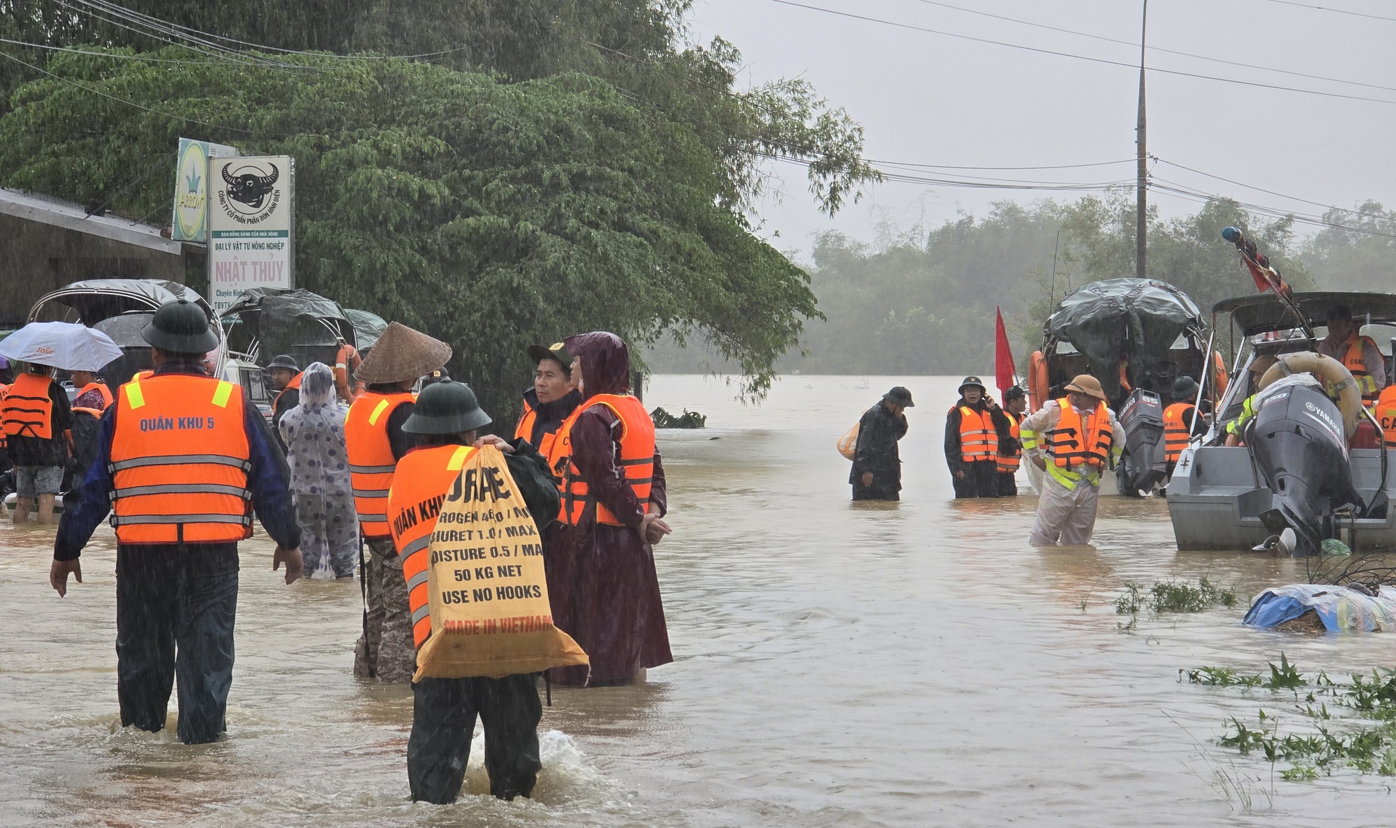 Trung tá Vũ Đình Quang, Phó trưởng Công an P.Điện Bàn Đông (TP.Đà Nẵng), cho biết: “Chúng tôi túc trực 100% quân số, đảm bảo không để xảy ra thương vong. Từng chuyến hàng được đưa vào trong vùng ngập bằng mọi cách”.