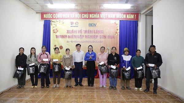 Tại chương trình, Ban Tổ chức và Ngân hàng BIDV Quảng Ngãi trao tặng 28 suất quà Tết gồm nhu yếu phẩm và tiền mặt cho 28 hộ gia đình thanh niên có hoàn cảnh khó khăn tại Làng; trao tặng 100 phần quà gồm sữa, bánh cho các em thiếu nhi tại Làng Thanh niên lập nghiệp Sơn Bua, tổng giá trị quà tặng hơn 30 triệu đồng.