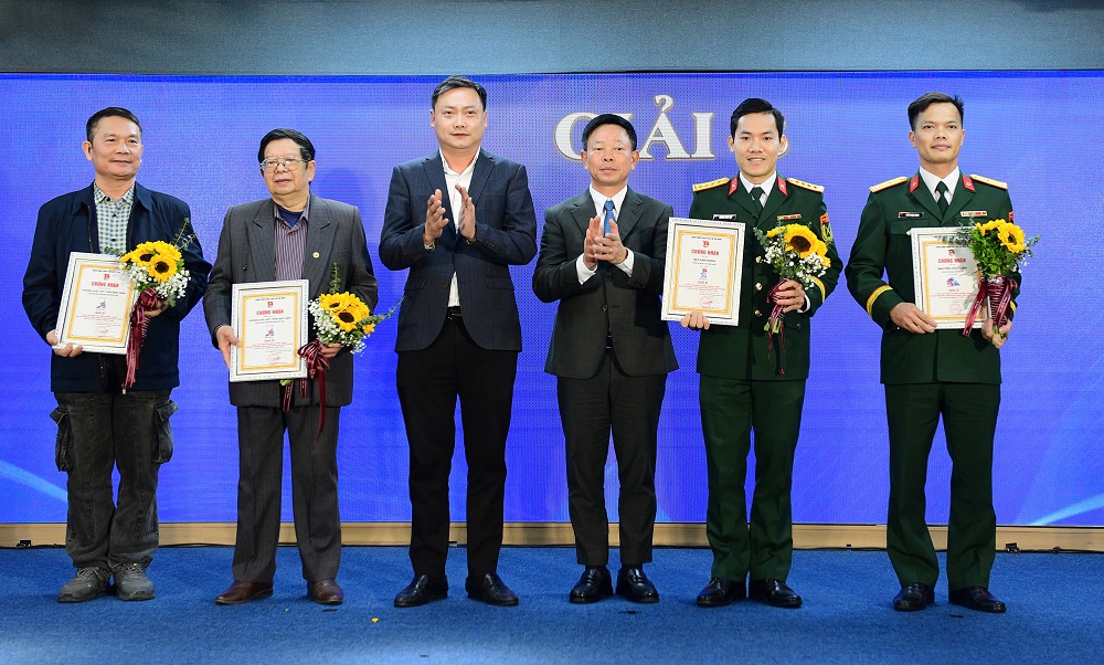 Đồng chí Nguyễn Quang Đức, Phó Trưởng Ban Tuyên giáo và Dân vận Đảng ủy Mặt trận Tổ quốc, các đoàn thể Trung ương và đồng chí Phùng Công Sưởng, Tổng Biên tập Báo Tiền phong trao giải B cho các tác giả